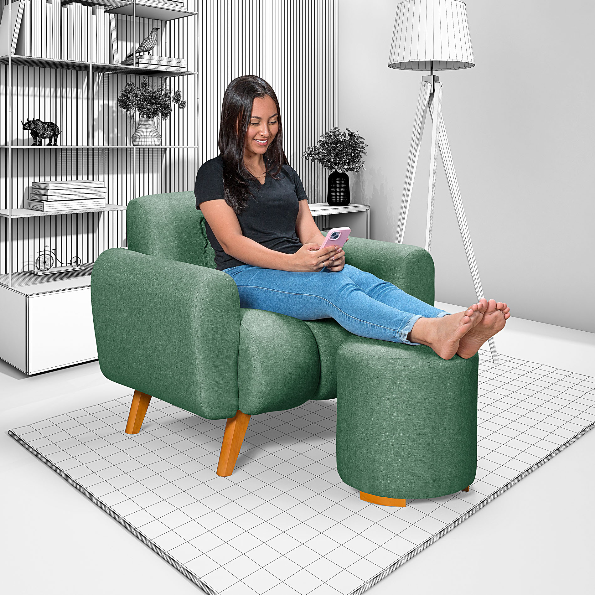 Poltrona Com Puff Dallas em Linho Verde